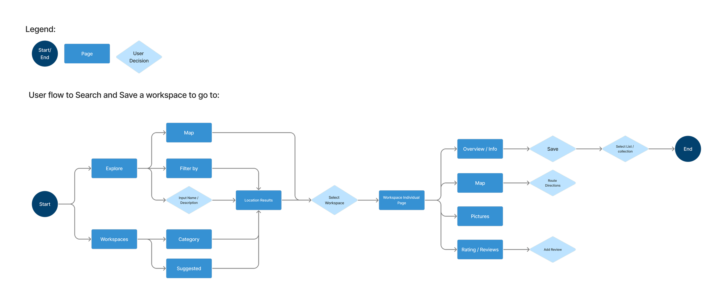 A Sitemap was created to map out how the app would be organized. Afterward, a User Flow was created to map out what the process of Searching and Saving a workspace would look like.