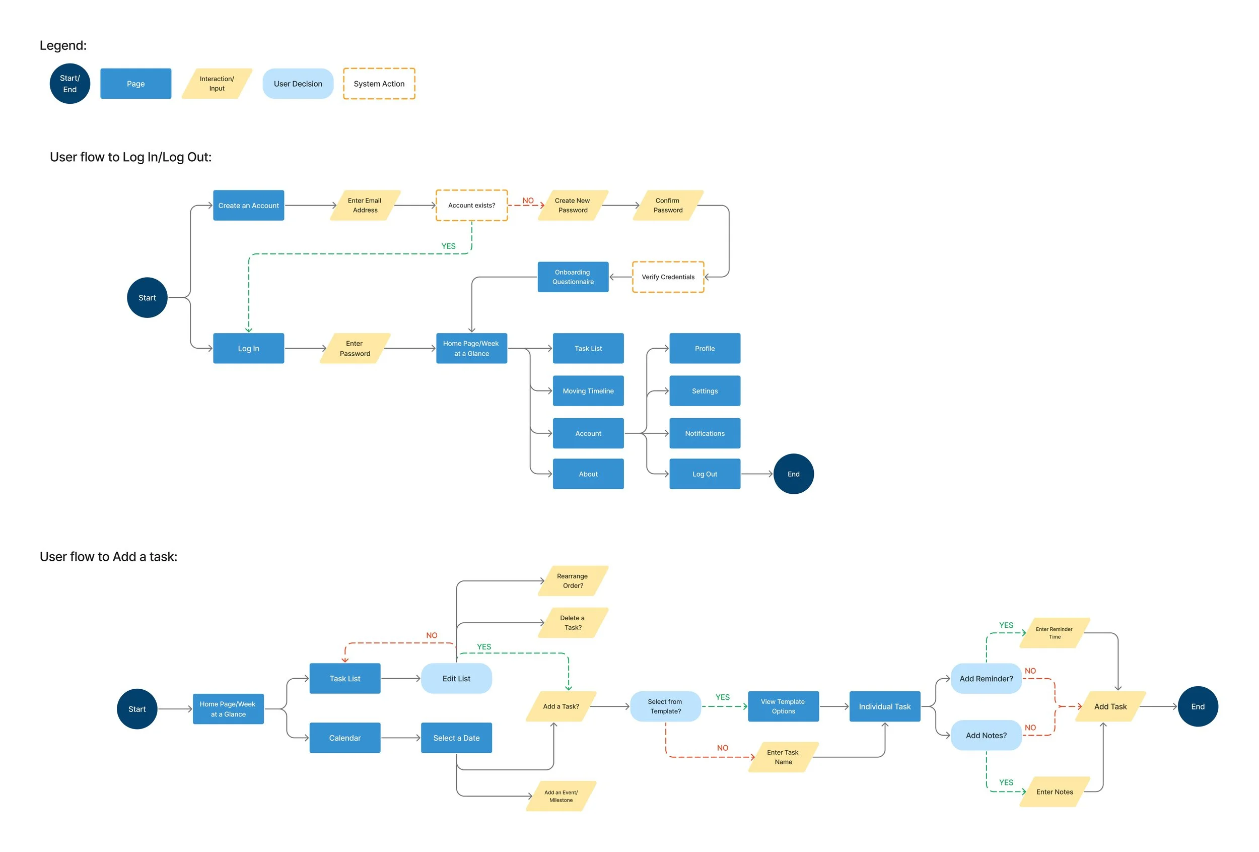 After the site map was finalized, 2 user flows were developed. We chose to focus on the user journeys of Logging In & Out and Adding a Task. As shown in the flows, the users have straightforward options on how to edit their task list - whether that be add, delete, or rearrange their tasks.