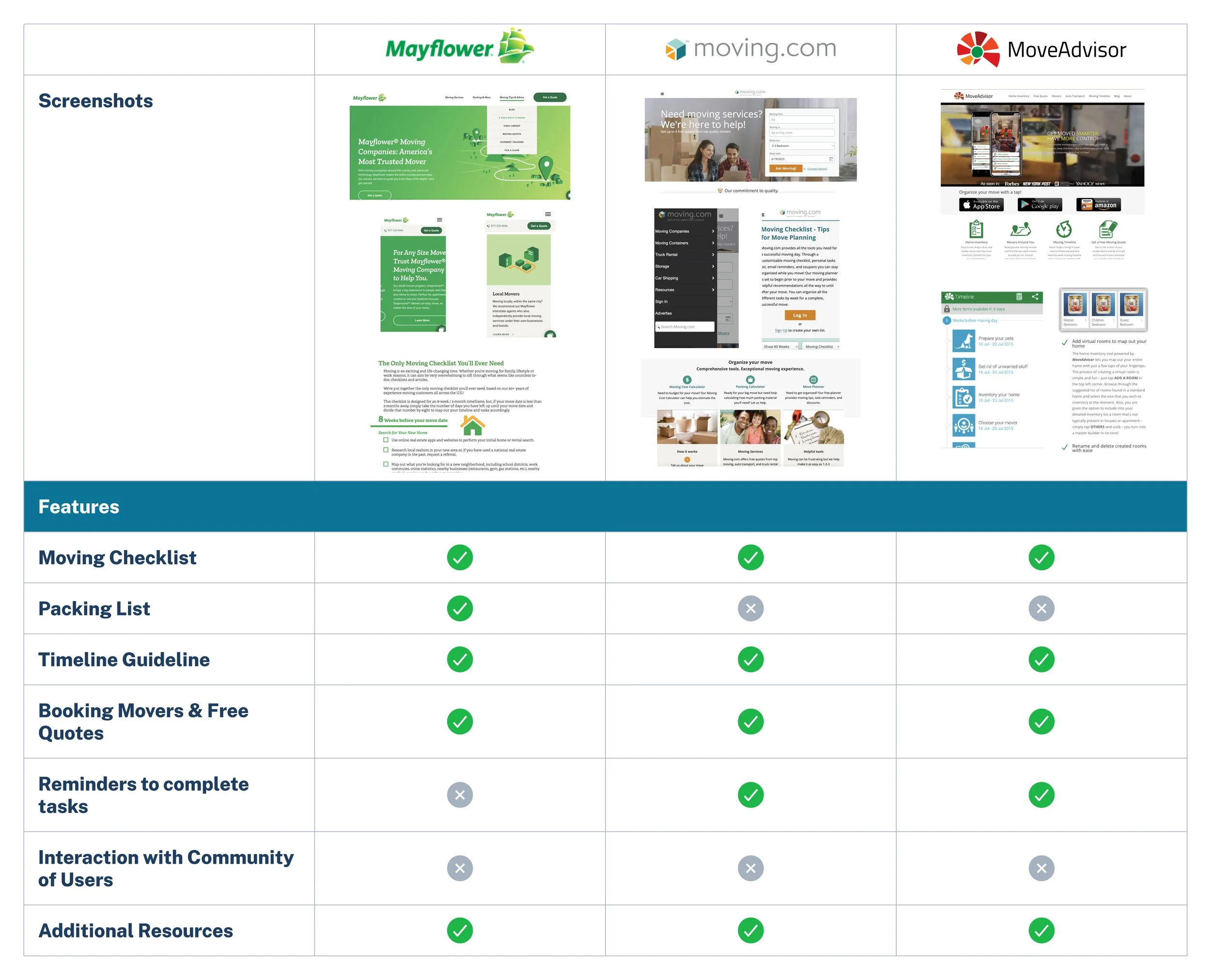 This research method was utilized to discover and compare existing services that help people plan their moves. We researched 3 services and gathered insights on how the websites are designed and what features are included in the services.