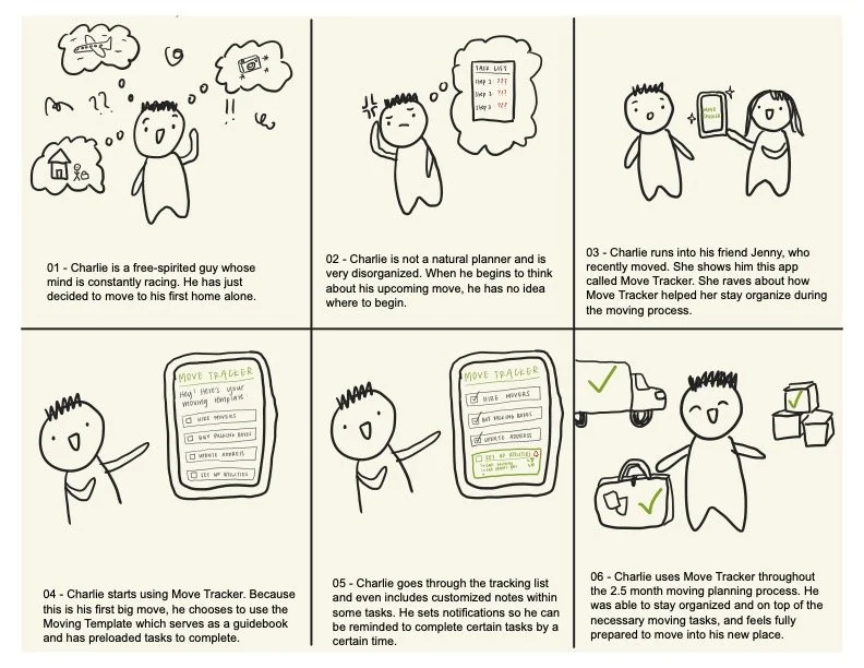 We created a storyboard for Charlie to illustrate how his moving planning processes can benefit from using the service.