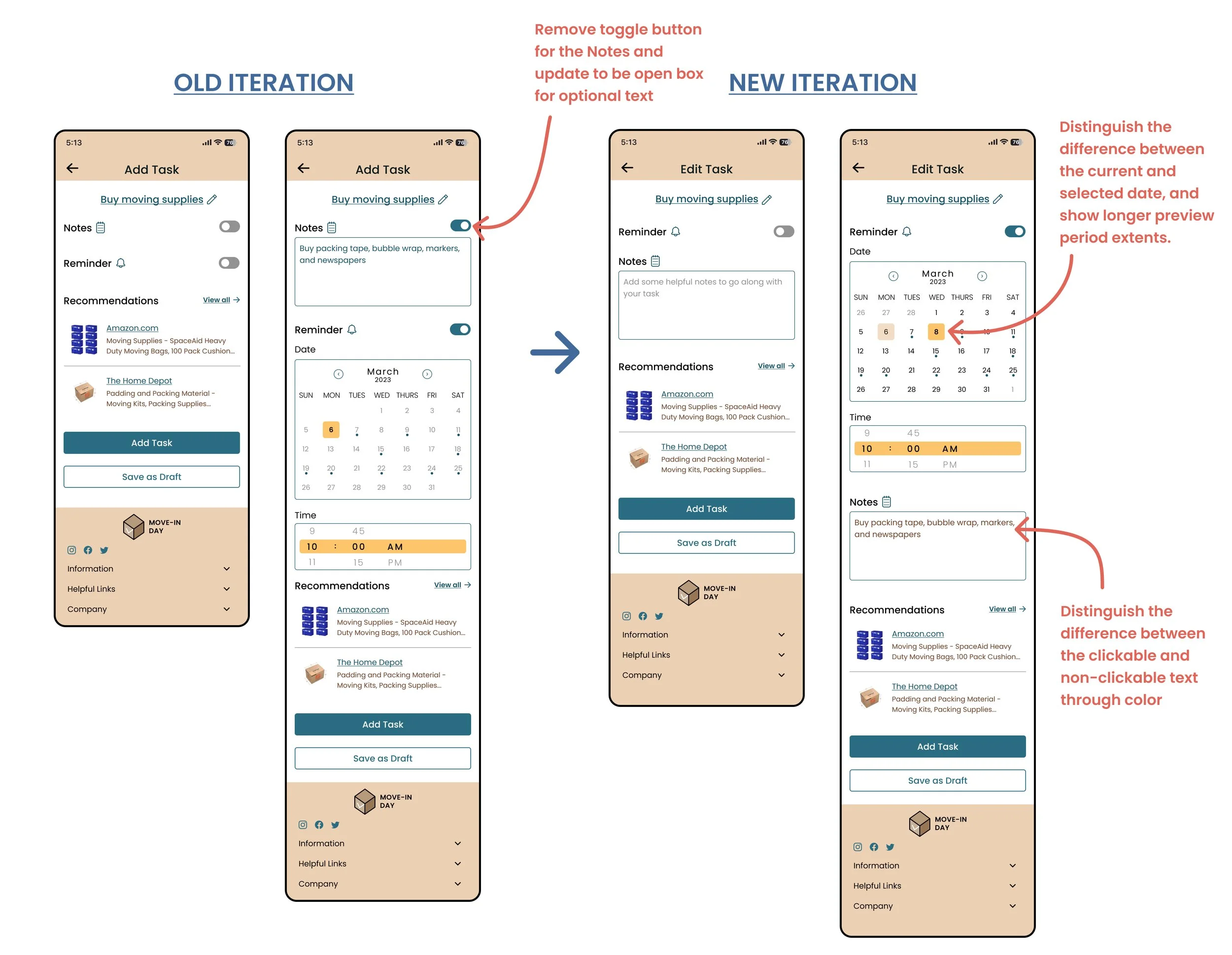 The second flow takes the User through the action of Adding a New Task from Move-In Day’s selection of preloaded template tasks. A template task includes helpful resources that correspond with the chosen task, such as recommendations of where to buy supplies.